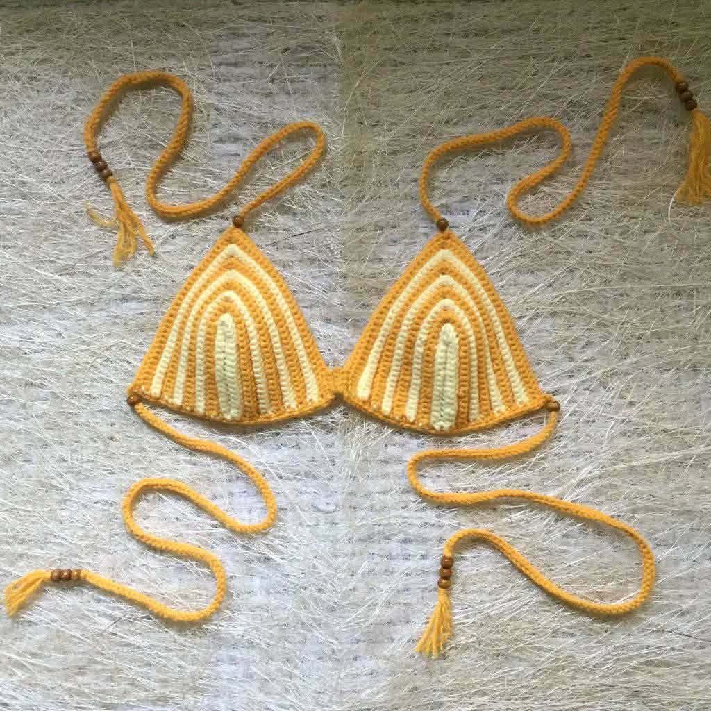 A handmade crochet bikini top in yellow and cream colors. It features a triangle design with detailed crochet patterns and adjustable strings with small beads and tassels. The soft yarn and stylish design make it perfect for beachwear or summer outfits.