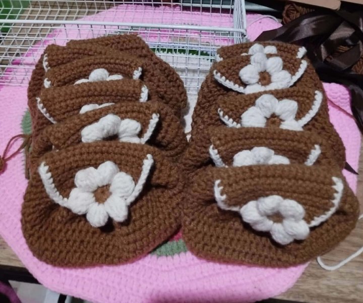 A handmade crochet pouch in brown color with a white flower design on the front. It is made from soft yarn and has a cute and simple style. This pouch can be used to store small items like coins, accessories, or personal belongings.